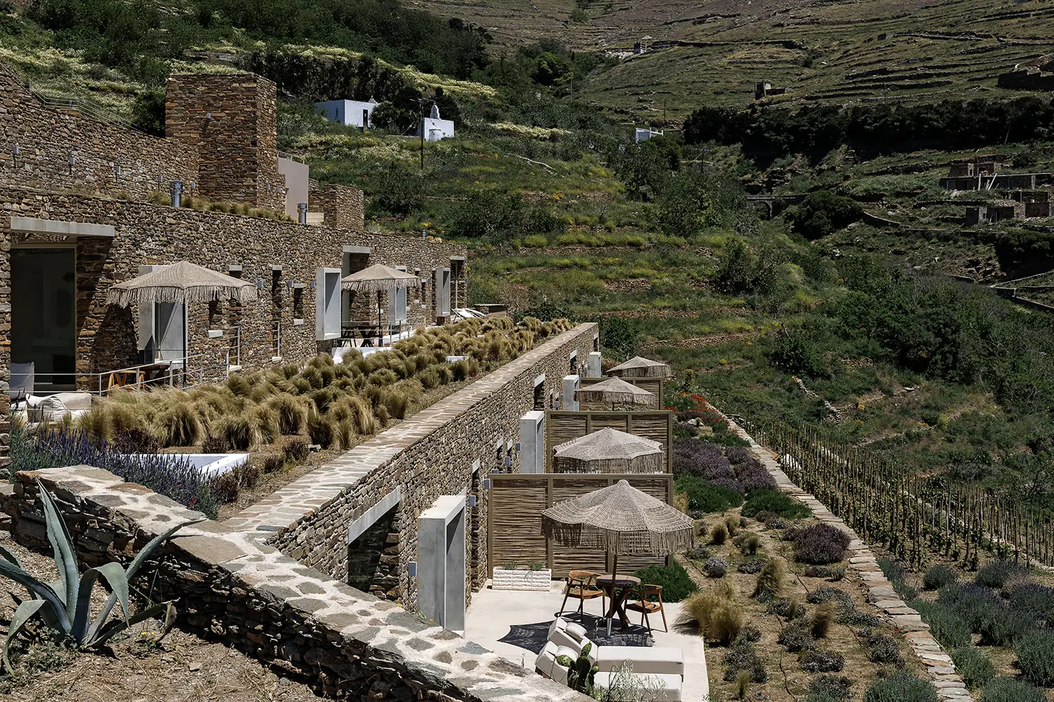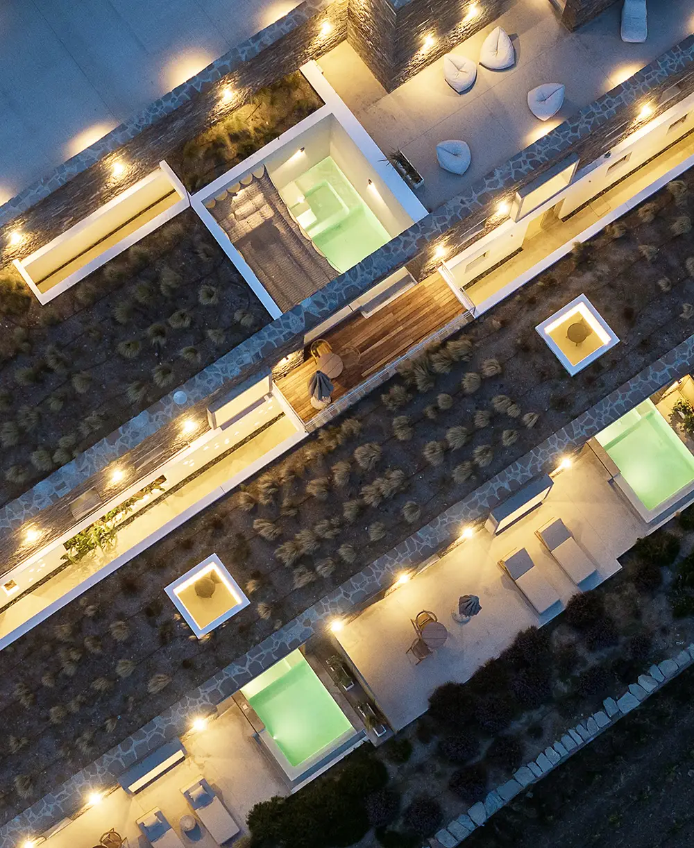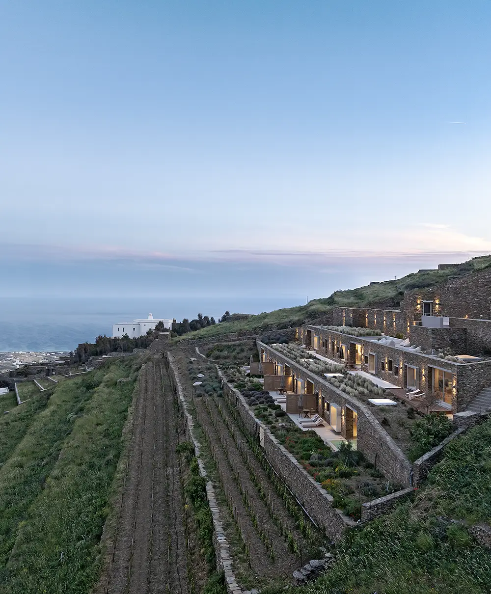 Built into the hillside, Ivy’s blends seamlessly with the natural landscape. Hidden within the slope, the architecture offers both privacy and peace — as if the space has always been part of the mountain itself. The six minimalist suites, designed with natural materials and bespoke furnishings by local artisans, each feature a private swimming pool and are arranged around a dry-stone courtyard that offers shelter from the island’s summer winds.