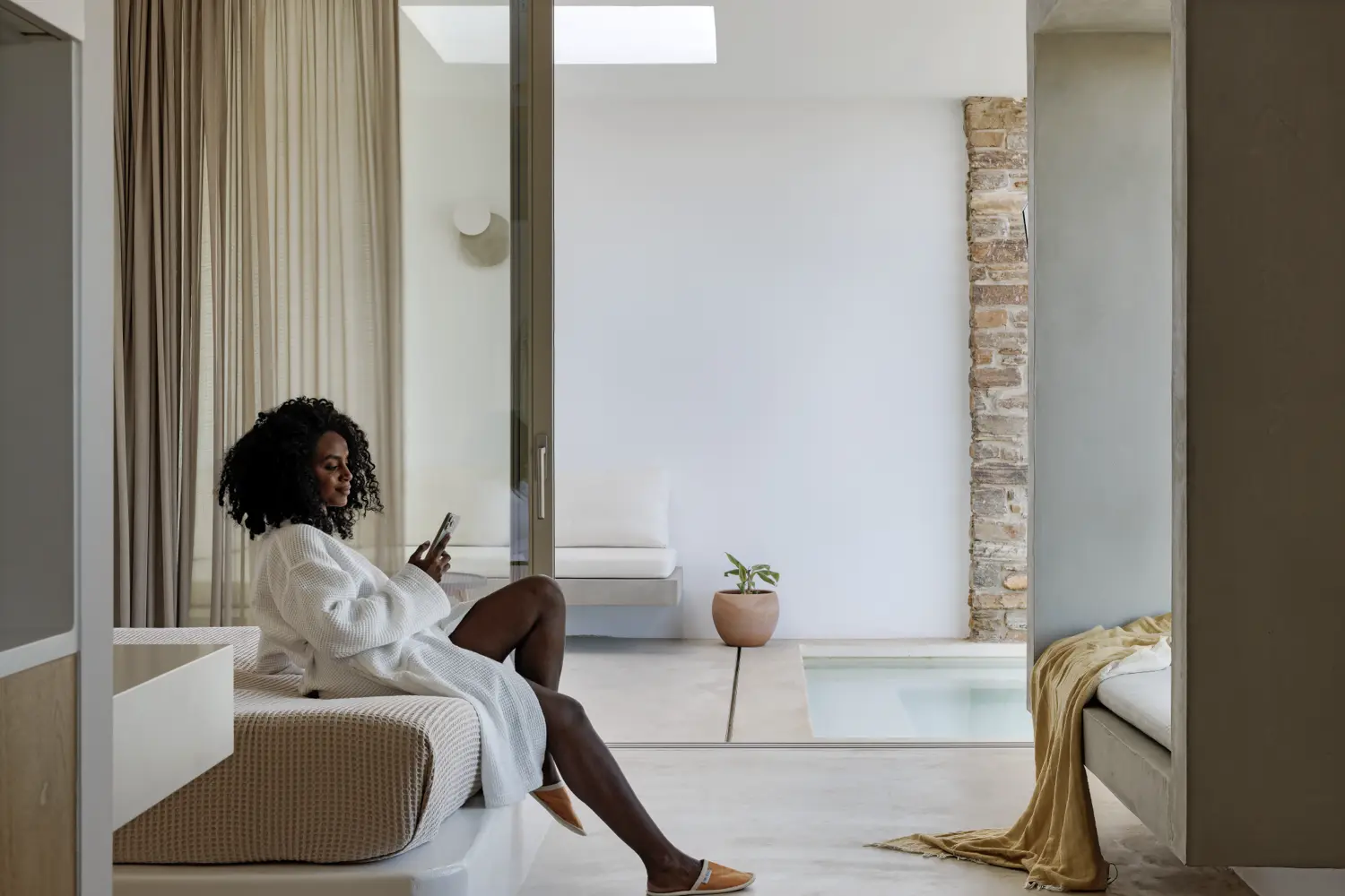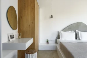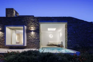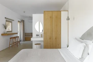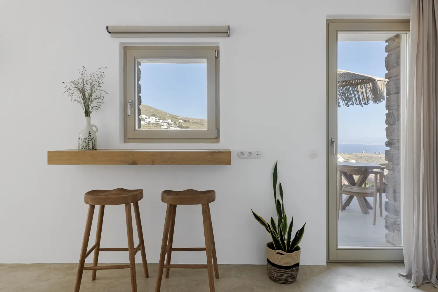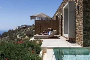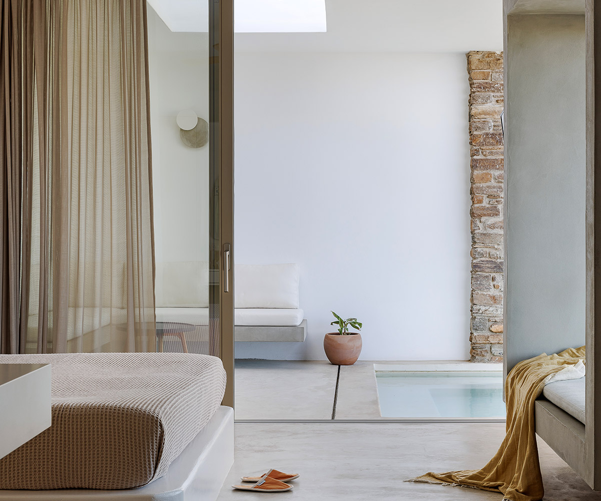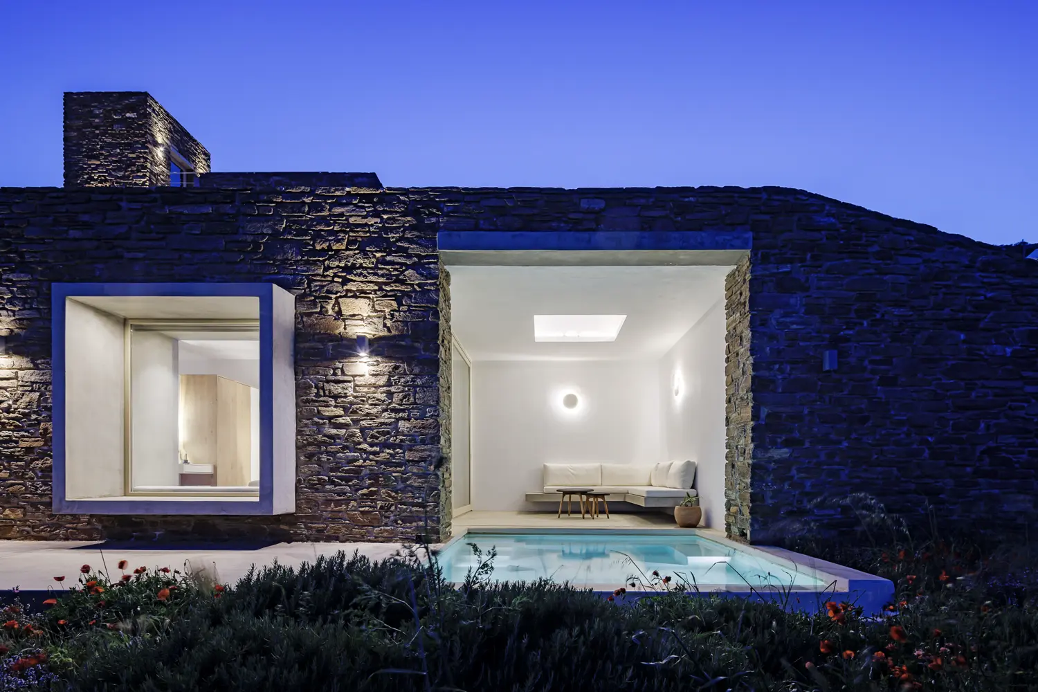 At its center lies a handcrafted bed, sculpted in homage to the surreal granite formations of Volax, the famed rocky village of Tinos. Designed to blur the line between inside and out, your private pool lies just steps from the bed, while a shaded patio offers a peaceful place to rest — sheltered from the wind yet open to the expansive Aegean view.
