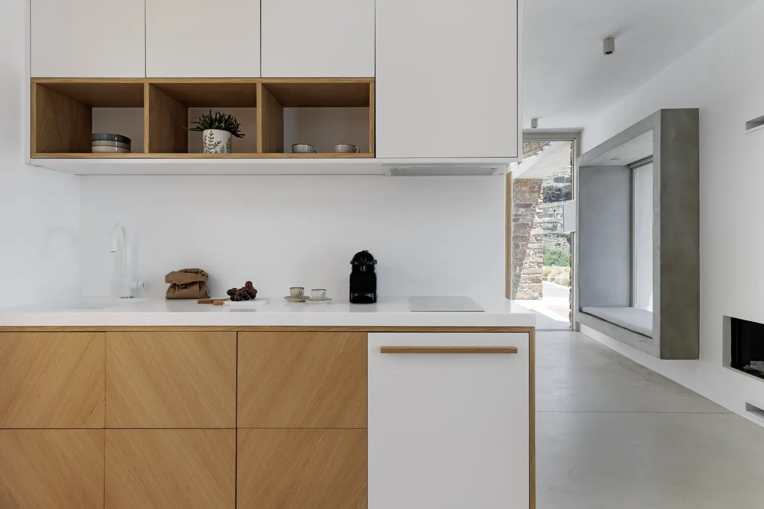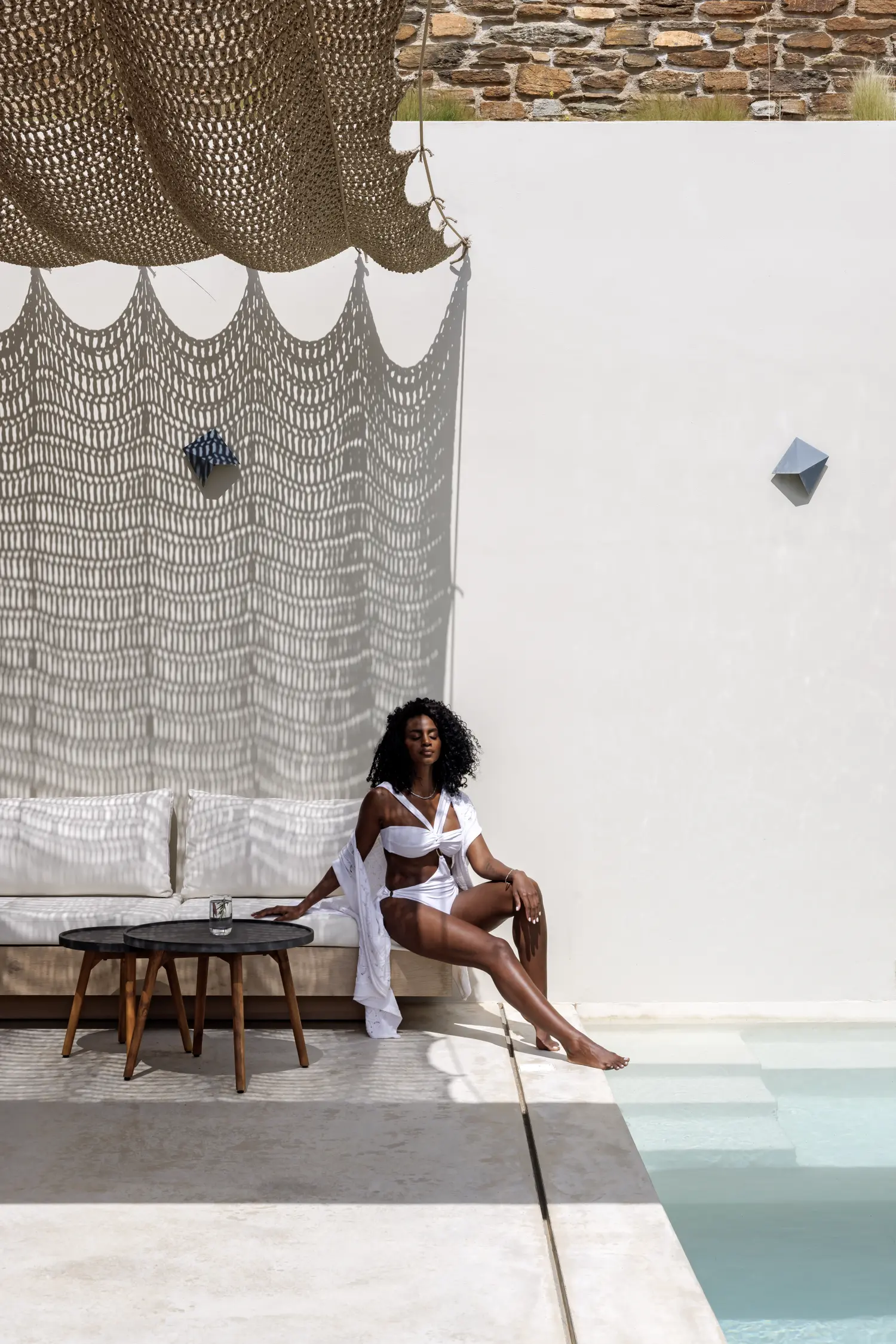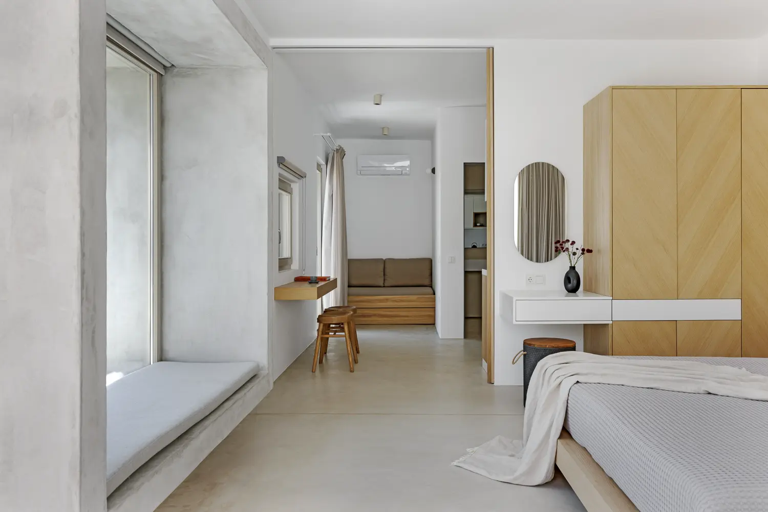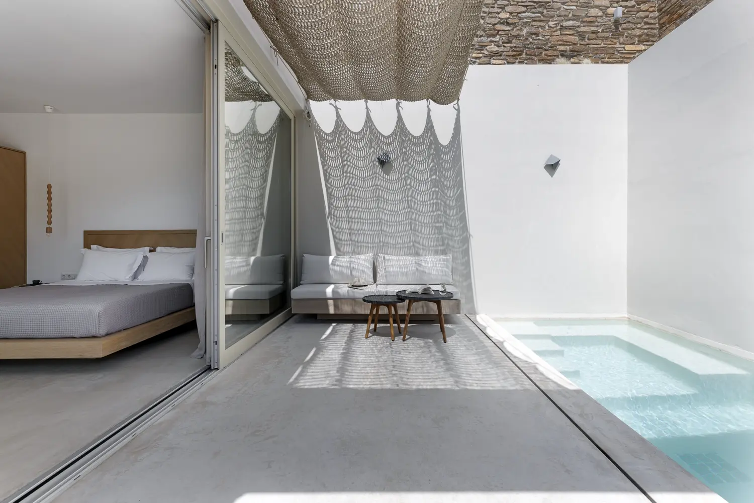 Spacious, open, and full of light, it features a fully equipped kitchen, a comfortable sofa-bed, and seamless indoor-outdoor flow. Outside, your private patio and pool open to panoramic views of the Aegean — a space to relax, reconnect, and feel at home.
